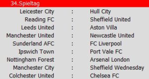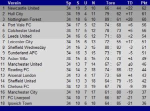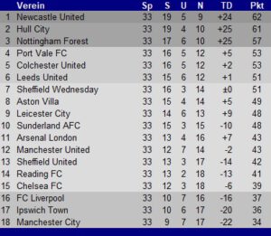 Weiter gehts im Titelrennen: Hull muss eine Auswärtsniederlage hinnehmen und gleichzeitig kann Newcastle sein Spiel gewinnen! Damit haben wir einen Wechsel an der Tabellenspitze! Ab nun ist also Newcastle das gejagte Team! Im Verfolger Trio kann wieder kein Team siegen. Somit wird der Titelkampf also zu einem Zweikampf…wobei Nottingham nach wie vor rechnerisch noch den Titel holen könnte! Sheffield Wednesday kann dieses Mal die Patzer der Konkurrenz nutzen und mit einem Sieg einen Platz gut machen und ist nun Fünfter! Aston Villa verliert weitere Plätze und wird regelrecht durchgereicht und ist nun nur noch auf Platz 8 zu finden! Port Vale hingegen (mit dem zweiten Sieg) springt auf einen internationalen Startplatz! Es bleibt aber in dieser Tabellenregion äußerst eng. Wer kann sich am Ende das europäische Ticket sichern? Alles noch offen! Im Abstiegskampf kann Chelsea den zweiten Sieg im Saisonfinale holen. Liverpool erkämpft sich ein Unentschieden…ein ganz wichtiger Punkt am Ende? City und auch Ipswich verlieren ihre Spiele. Damit rückt der Klassenerhalt in weite Ferne. Liverpool kann immerhin einen Platz gut machen. Dennoch müssen 4 Punkte aufgeholt werden. Neu im Abstiegskampf ist plötzlich Reading, die Platz 15 einnehmen und nun plötzlich auch zittern müssen.